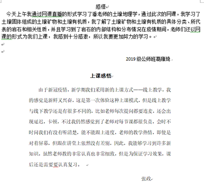 2019级地理科学3班牟兰若:通过今天的网课,我感触颇深。正式上课之前,老师们已经在不同平台进行多次调试,保证今日课程可以顺利进行。老师们精心准备的课件,我们与老师积极的互动,网络授课的形式可以更方便的让我们与老师交流。我也就自己的疑惑提出了一些问题,得到了耐心的讲解和帮助。同学们也积极配合老师的问题。当然,我也有一些不足,因为第一次使用,有些功能还不熟练,我应当吸取今天的经验,加快记笔记的速度,在以后的网课学习中更好地跟上老师的节奏。今天的网课我不仅体验了互联网带给我们的便捷,还收获了许多知识,可谓是收获颇丰。通过今日的网课,我一定会总结反思,更好地与老师配合,高效率的完成课堂内容。并进行复习和归纳。