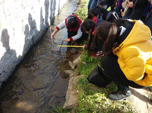 在老师们的指导下,同学们分成小组在日照水库周边的一流动水域,运用流速仪、测杆和米尺测量水流流速和横断面面积,然后进行流量的计算。通过测量,同学们熟悉了测量器材的使用,锻炼了大家的协作能力,在学习中增进了友谊。