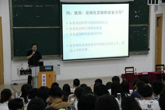 黄教授以通俗的语言解读了绿色发展、“绿色鸿沟”的内涵;以直观的数据对比说明当前绿色发展的方向;以丰富的案例分析了绿色鸿沟正在加大的事实;用缜密的逻辑分析了人与生态的依存关系;并以江苏省的经济大战为例,阐述了如何创新发展,进行生态经营,建立新型绿色化社会。他强调了构建创新型绿色化发展机制的必要性。两个小时转瞬即逝,黄教授由浅入深,为现场师生带来了一场精彩绝伦的讲座。最后,黄教授耐心地解答了在场同学的疑惑。