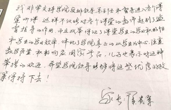 不知不觉,儿子上网课已经两个周了。作为一名人民教师的我,也跟我的学生们进行了一周的线上教学,一开始我和儿子一样,对这种新颖的上课形式表现出了各种的不适应,但是经过师生的共同努力,逐渐地克服了这个问题,儿子也从假期的倦怠中全身心地投入了丰富多彩的课堂中去了,儿子也十分自觉,根据学院的要求,认真完成学院每天规定的任务,课堂笔记、洗衣做饭、运动健身,一样也没有落下。在上网课的这段时间里,儿子每节课都会提前十分钟坐在书桌前做好上课准备,等待教师发起课堂,日日如此。对于学院近期开展的领导、系主任和督导进入各个课堂听课政策,此举不仅仅能提高学生和教师的课堂参与度,督促学生和教师做好自己的本职,从而保证了课堂的效率,也积极响应了国家的号召,为学院的决策点赞!——家长:侯贵军