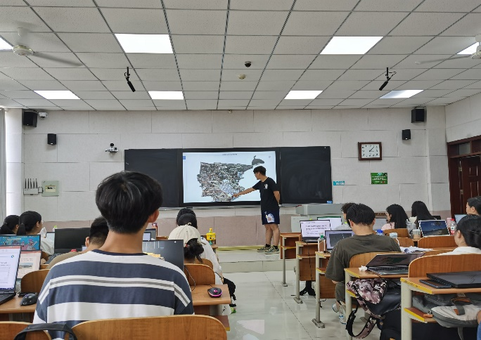 第三天进行内业工作,首先,老师在空间规划实验室细致讲解ArcGIS10X软件的运用,进行遥感影像目视解译,统计地类面积,制作土地利用现状图,掌握土地利用现状图的编制方法。讲解结束后,同学们团结协作,以小组为单位进行自由探索,对老师布置的任务进行针对性讨论。