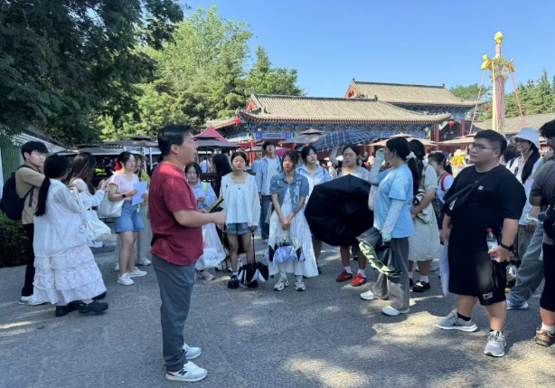7月6号,同学们来到了万岁山武侠城。这是一座以大宋武侠文化为核心的主题景区。在进入园区之前,指导老师就文旅融合开发模式、景区布局、娱乐与演艺活动项目设计进行了讲解,并对大家调研的作业任务重点进行了布置。