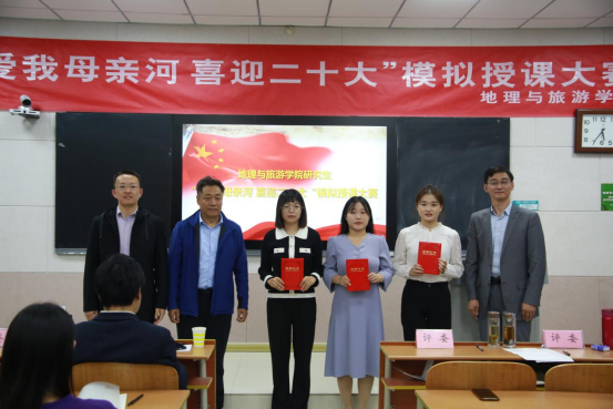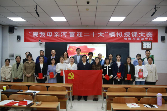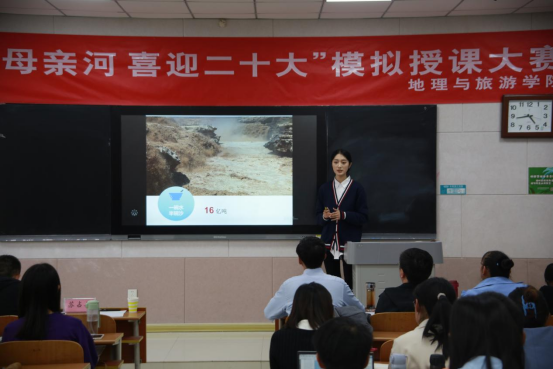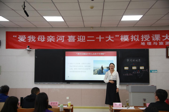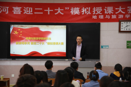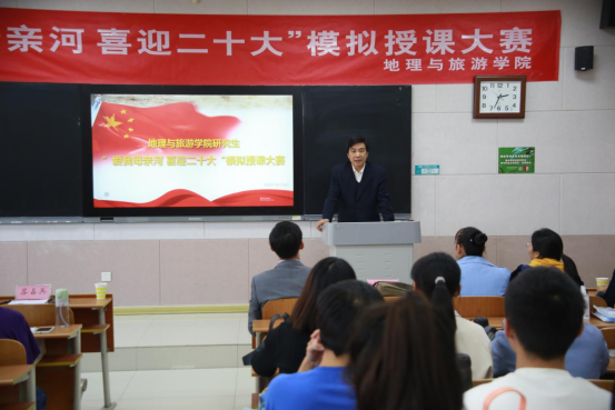 研究生党支部与研究生团支部在S206联合开展“爱我母亲河,喜迎二十大”模拟授课比赛,学院党委书记苏占兵出席并讲话,学院副院长吴军、于伟、学院教学督导及教职工党支部书记刘志刚、学科教学(地理)专业学位点负责人吕宜平以及李剑、李瑞平、孙丕苓等七位老师担任比赛评委,比赛由番茄社区