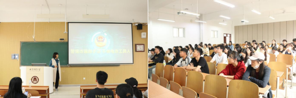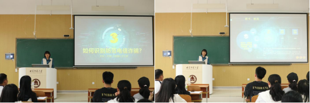 赵岩老师鉴于当前电信诈骗形势严峻、花样翻新的局面,着重指出警惕诈骗新手段、不做电诈工具人的重要性。从“什么是电信诈骗”“电信诈骗的常见形式”“如何识别防范电信诈骗”“避免成为帮助犯”四个方面展开电信网络安全教育,并提醒同学们对于涉及金钱交易、个人信息泄露的要求,要坚决说“不”。