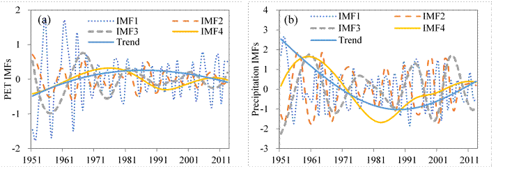 1951-2013年沂河流域降水和潜在蒸发在年际、年代际和多年代际尺度上的变化