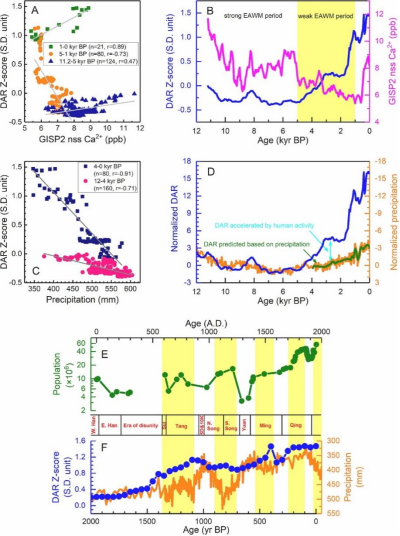 (4)人类活动的影响可能叠加在夏季风控制的粉尘活动之上。研究发现,在夏季风降水量相同的情况下,4 ka以来的风尘堆积速率显著高于之前。这一时间节点与新石器时代向青铜时代的过渡相吻合,伴随着粉尘源区古人类遗址的数量的增加。表明随着生产水平的提高和人口数量的增加,在4 ka时人类活动的强度可能已经达到影响风尘活动所需的阈值。2 ka以来,存在多个风尘堆积速率的增加同降水量不匹配的时期,如600–850 CE、1050–1250 CE、1400–1550 CE和1700–1850 CE,这些时期均与粉尘源区人口数量的增加相吻合。