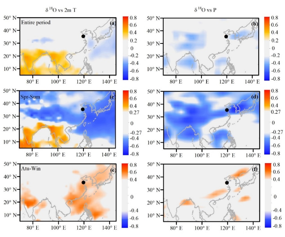日照地区降水δ18O与整个观测期(a)、春夏季节(c)和秋冬季节(e)的NOAA 2 m温度的相关系数空间分布;降水δ18O与整个观测期(b)、春夏季节(d)和秋冬季节(f)GPC日降水量的关系。