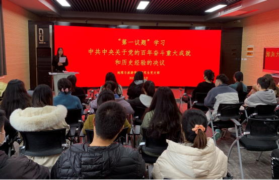 活动开始,支部组织委员张园园同志带领大家进行了“第一议题”的学习,本次活动第一议题的学习内容是《中共中央关于党的百年奋斗重大成就和历史经验的决议》,《决议》通篇贯穿习近平新时代中国特色社会主义思想,全面回顾总结党的百年奋斗历程和重大成就,深刻阐述党百年奋斗的历史意义和历史经验,对实现第二个百年奋斗目标提出明确要求,是新时代中国共产党人牢记初心使命、坚持和发展中国特色社会主义的政治宣言,是以史为鉴、开创未来、实现中华民族伟大复兴的行动指南,是一份具有极强历史穿透力、思想引领力、政治动员力、时代感召力的马克思主义纲领性文献。