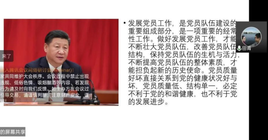 田青从新时代党员队伍建设的重要意义、党员发展原则与党员发展程序三个方面讲起,向同学们介绍了番茄社区