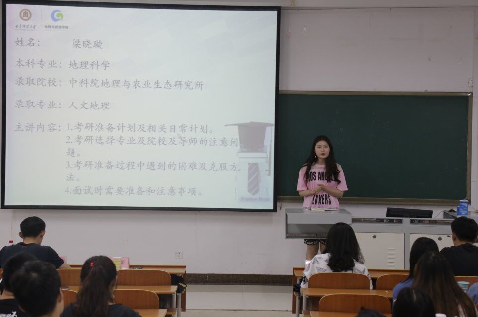 会上,主持人对参加本次交流会的嘉宾进行简单介绍,并指出此次交流会主要针对自然地理与资源环境、人文地理与城乡规划、地理科学专业的学生。7位学生代表分别从报考学校、考研备战、学习计划、心态调整、参考资料的选择和面试技巧等方面进行分享。彭思佳讲述了自己的面试经历,从专业知识和应对导师提问两个方面给同学们提出建议。崔朝峰就考研过程中时间的安排和资料的选择进行讲解,张亚琳主要介绍了考研过程中心态的调整。讲解结束后,同学们对自己感兴趣的问题进行提问,师哥师姐们悉心回答。他们用亲身经历告诉与会人员,考研是一个漫长而艰苦的过程,要做好计划持之以恒,才能实现目标。