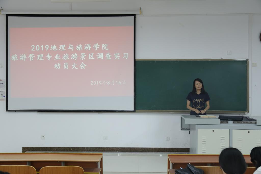 于8月16日在S201召开2019年旅游管理专业旅游景区调查实习动员大会。本次会议由于伟老师主持,党委书记苏占兵、院长张全景、党委副书记刘伟、团委书记宁晓文及谭丽荣、邓薇、陈艳峰相关专业教师出席,2018级旅游管理专业学生及相关研究生参加。
