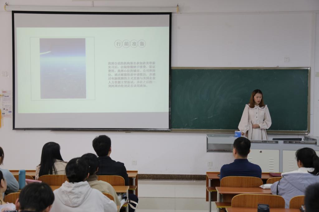 的开展情况进行介绍,并指出该项目是旅游管理专业的特色实习项目,希望同学们能够积极参加。他提到学院将加大赴美带薪项目的推进力度,使更多的同学能够参与境外实习。三名学生代表分别从实习内容、行前准备、当地风俗人情、景点调研、实习总结等方面进行分享。付文霭讲述自身实习经历,就前期准备工作给同学提出尽快提高英语听说读写能力、了解当地文化的建议。吕岩就实习生活进行分享,使同学们对美国风俗人情、旅游行业发展方向和动态有更深入的认识。先珈仪主要介绍了赴美带薪实习将理论知识与实地考察相结合,具有丰富专业知识,提高专业能力的重要意义。讲解结束后,刘伟、叶德舜为优秀学生代表进行颁奖。同时,叶德舜就赴美带薪项目的合法性、安全性,实习工作职位,实习收入等方面进行详细介绍,并对同学的提问进行悉心解答。