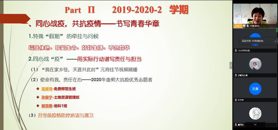班会伊始,李梅亲切地问候同学们在家学习的情况和居家存在的问题,并对同学们表达牵挂与思念。通过回顾同学们踏入曲园后参加的军训国防教育、鬼步舞大赛等多种活动,她充分肯定了同学们在上一学期参加各种活动以及学业上取得的优异成绩,并希望同学们在居家学习也要自律自强,居家学习“不掉线”,实现自我价值与能力的完善和提升。随后,她以图片展示的方式,向同学们介绍我校为开学做准备而进行的疫情防控培训与演练、宿舍园区的改造结果等,同学们纷纷表示出对返校的期待。她谈到,在过去这段共同抗击疫情的日子里,许多同学为抗击疫情贡献出了自己的青春力量,并着重对获得曲师大抗疫优秀志愿者的三位2019级同学——邴雪雨、葛雍琦、孙宸宁进行了赞扬,希望同学们能将这种勇于担当、不负韶华的精神落实到今后的生活、学习上。