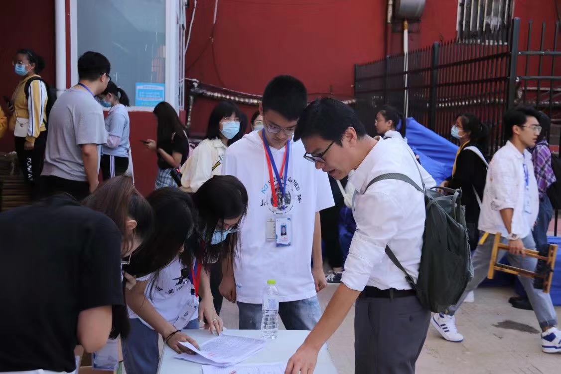 2019级辅导员李梅、2020级辅导员田青一早来到学院的注册点,监督当天的迎新布置工作,学院相关工作人员、学生志愿者们也早早就位,准备迎接新生。