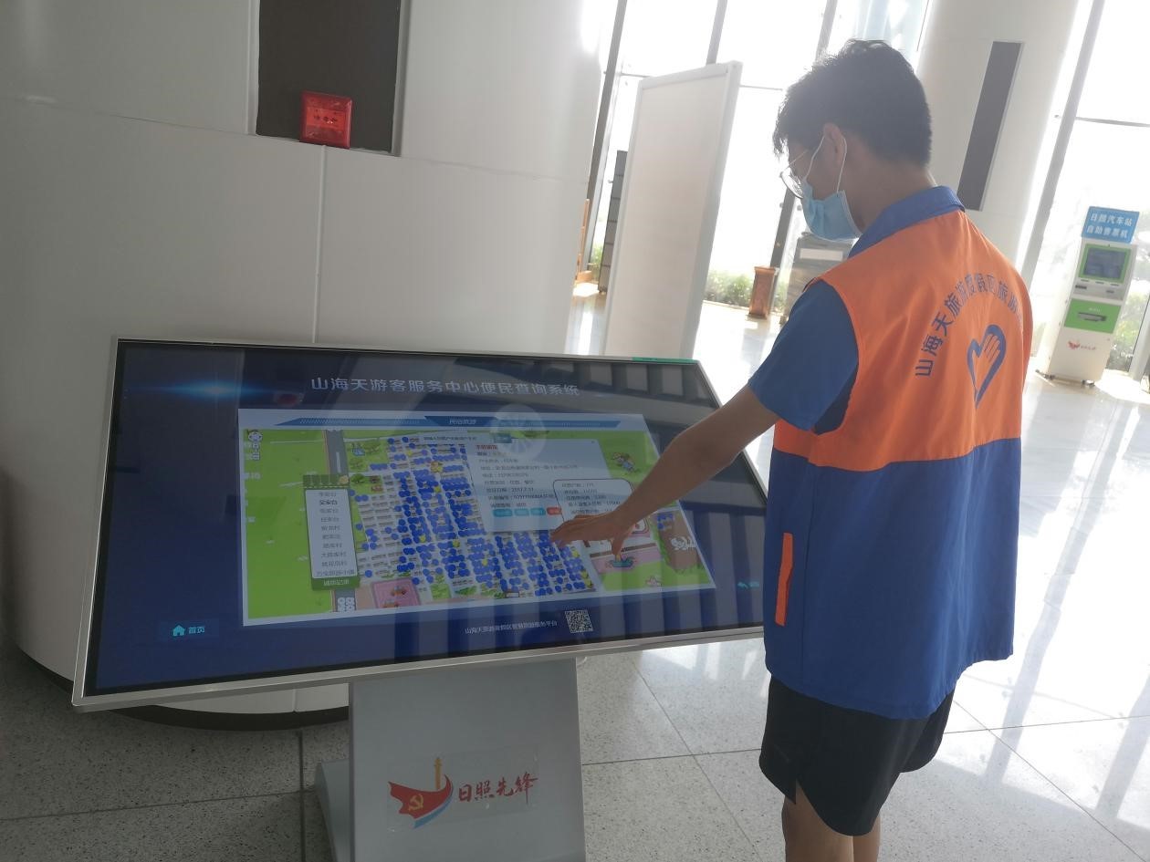 一天的工作已接近尾声,为确保以后服务工作的顺利展开,工作人员带领实践队成员进行参观,熟悉各环节流程。到达智慧旅游服务平台时,山海天旅游度假区主任自豪的向实践队员介绍:“山海天旅游度假区服务中心的智慧旅游服务平台是利用信息化技术,主动感知旅游资源、旅游经济、旅游活动、旅游者信息,让游客及时安排和调整工作和旅游计划。通过网络与游客实时互动,获得个性化的旅游产品。”为了便于实践队员更好理解,主任进行亲自演示,队员们更是充满浓厚的兴趣,按捺不住的主动实践,并成功了解到景区周围的酒店价格,交通情况,物价水平,天气状况,民宿环境等各方面情况。实践队员纷纷感叹,通过一个小小的机器就可以全方位了解到整个景区的状况,甚至不需要人工指导就可以完成,科技的进步真的是推动了后疫情时代下旅游行业的进一步发展。