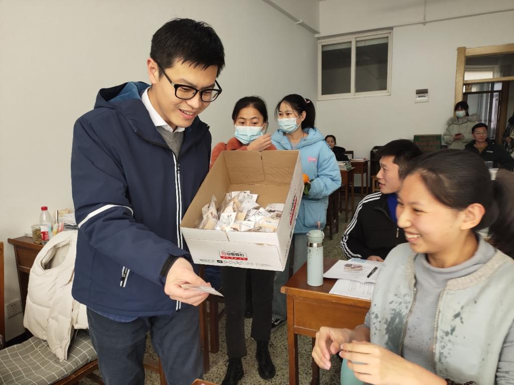 田青老师为考研学子分发象征心想事“橙”的幸运橙子,请同学们抽取幸运钥匙扣,并亲手为同学们挂上。钥匙扣包含逢考必过、万事大吉、诸事皆宜、万事胜意和砥砺前行五款,表达了对考研学子的美好祝愿与殷切期待。活动中,老师为每一位考研学子送上了真挚的祝福,祝愿学子们心想事“橙”、一定能“橙”。他肯定了考研学子的勤奋努力,希望学子们最后阶段能够坚定理想、不忘初心、砥砺前行;要劳逸结合、放松心情,以最好的状态迎接考研。