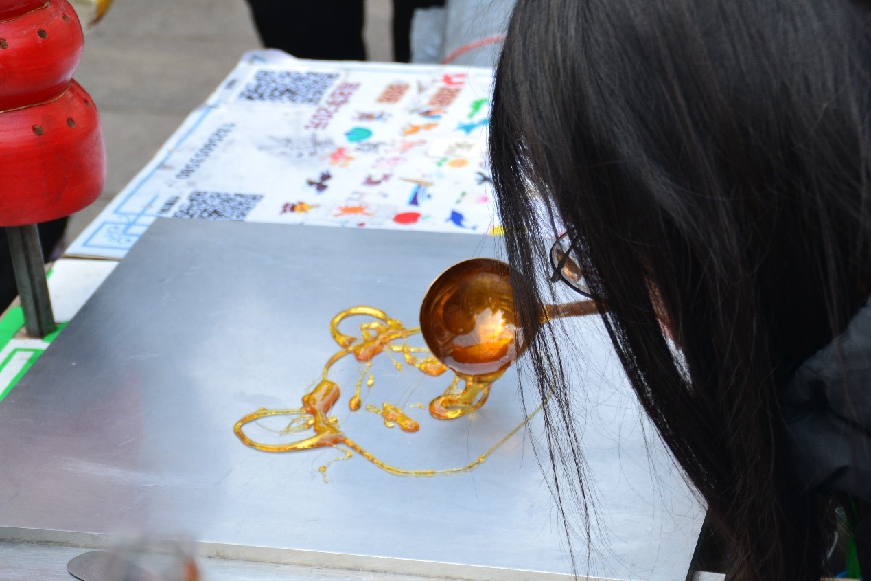 随后,在郑师傅的指导下,队员们体验了糖画制作。糖画制作看似简单,实则并不容易。队员们拿起勺子,总是出现各种各样的问题,如笔画的粗细不一、画不出心中的图案、作品没完成糖浆已凝固等等,可见小小糖画背后会有多少的刻苦练习。在郑师傅的热情指导下,队员们得到了较为满意的作品。也更深刻地体会到了传承一门手艺的不易。