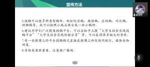 会议伊始,张政首先分享她个人社会实践积累的经验,她从选题方向、团队组建、前期准备、实践过程、后期宣传全方面地介绍了社会实践的过程,她告诫各实践队伍最后呈现的整个社会实践成果取决于实践过程中的每一步,所以在实践过程中要严格遵守计划,遇到困难不要懈怠,积极寻找解决办法。而姜怡合则重点强调前期准备与后期宣传,她指出一定要查阅大量与实践相关的论文文献,查阅有关新闻,了解实践地情况,同时要和指导老师积极交流,确定详细的实践方案。同时她重点强调后期宣传的重要性,一定要注意时效性,效率性。同时投稿时要注意稿件质量,严格遵守平台规定。