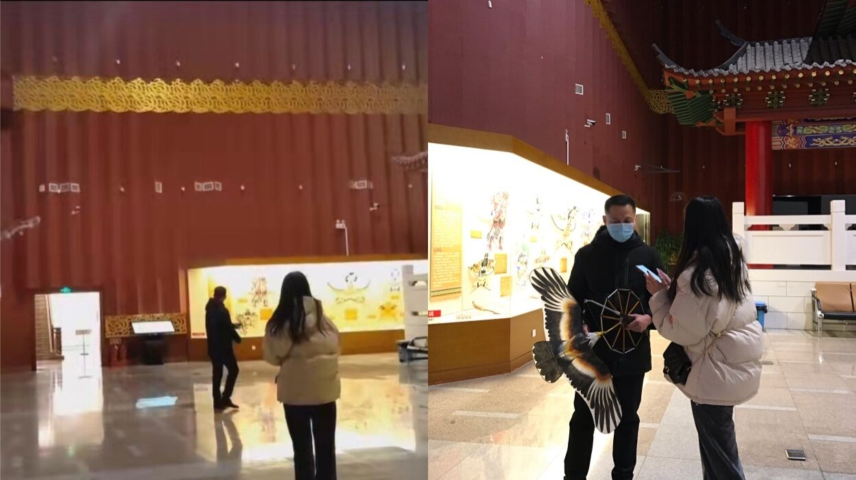 “寻迹”小队来到了潍坊世界风筝博物馆。博物馆外观气势恢弘,门口的鲁班雕像更给人一种肃穆的感觉。经过严格的防疫检查手续,我们成功进入到馆内,一进门便被精致华丽的装饰所惊艳。据介绍,博物馆自1989年建成以来,不断在装修上进行完善改进,才有了今天的样子,精致的装潢不但能更好地展示风筝的风采,也能带给游馆人良好的视觉感受,从而吸引更多的人参与到风筝文化传承的队伍当中来。