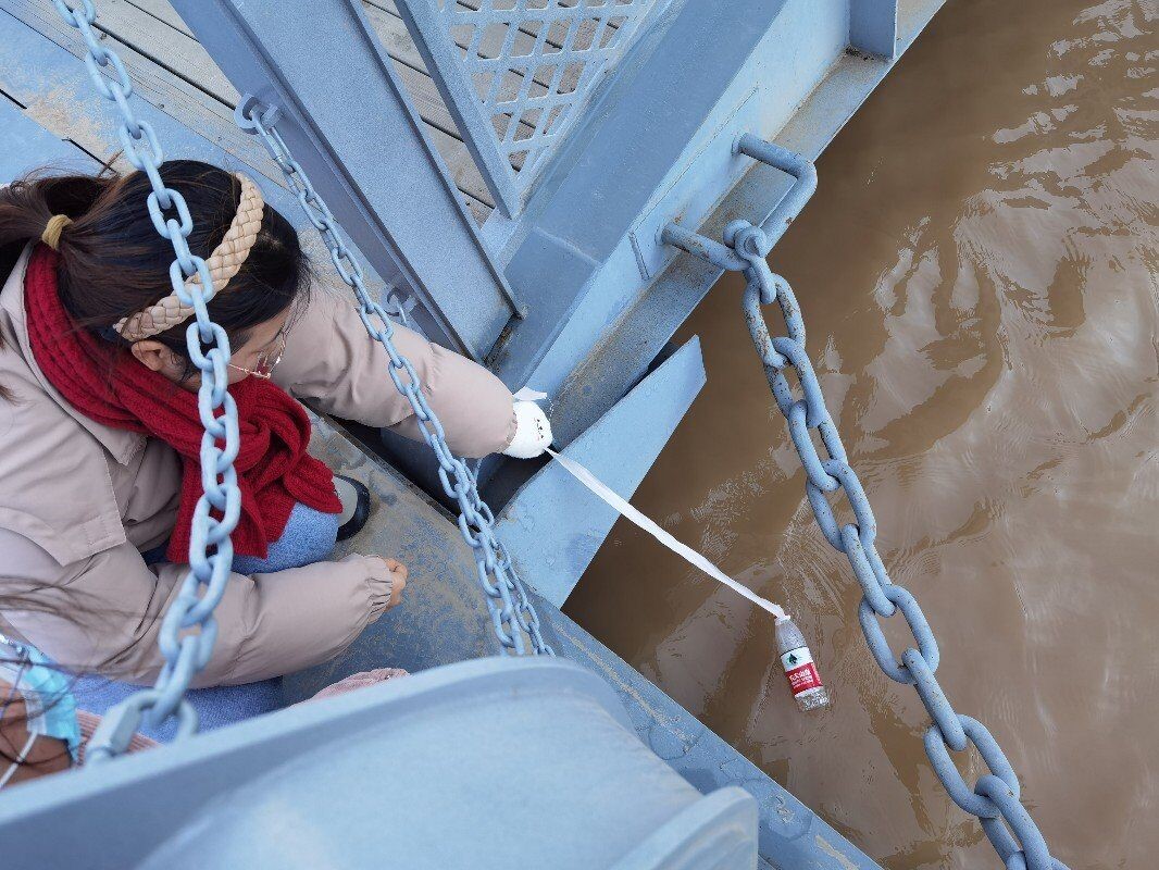 分队二沿着河上木桥,对黄河水进行隔段采集,保证采取点在地理位置上尽量分布均匀。队员们尽量选择了人为干涉较少的水域进行取水使最后研究数据成果可信度更高。途中遇到的最大的困难便是河水结冰和采取点过高。在当地人民和其他游客们的热情指导和队员们相互帮助扶持下,一路向前,破冰取水,吊绳灌水,即使被严寒席卷,但仍在规定的时间内顺利完成了取水任务。黄河水并不全是黄色。由于河面结冰,冰面下的黄河水中的泥沙得到了充分的沉淀,使中上层黄河水清澈了许多,只有在黄河奔流不息的地段河水才显得浑浊,呈现土黄色。