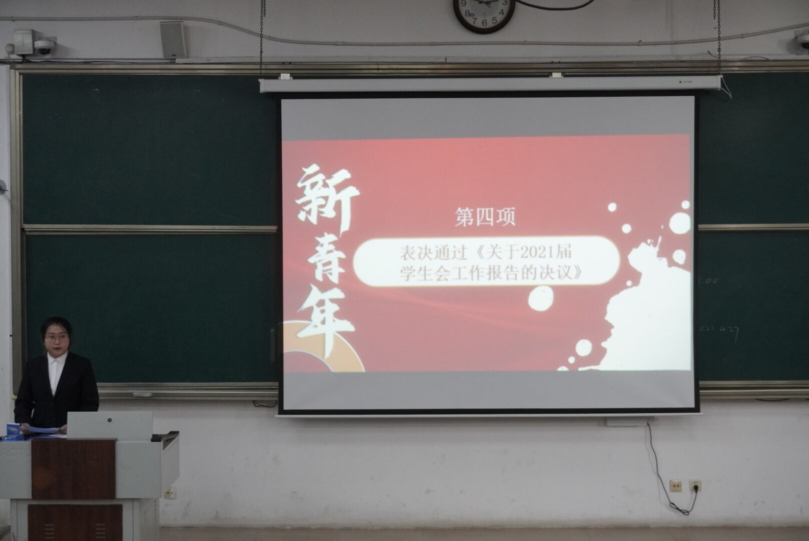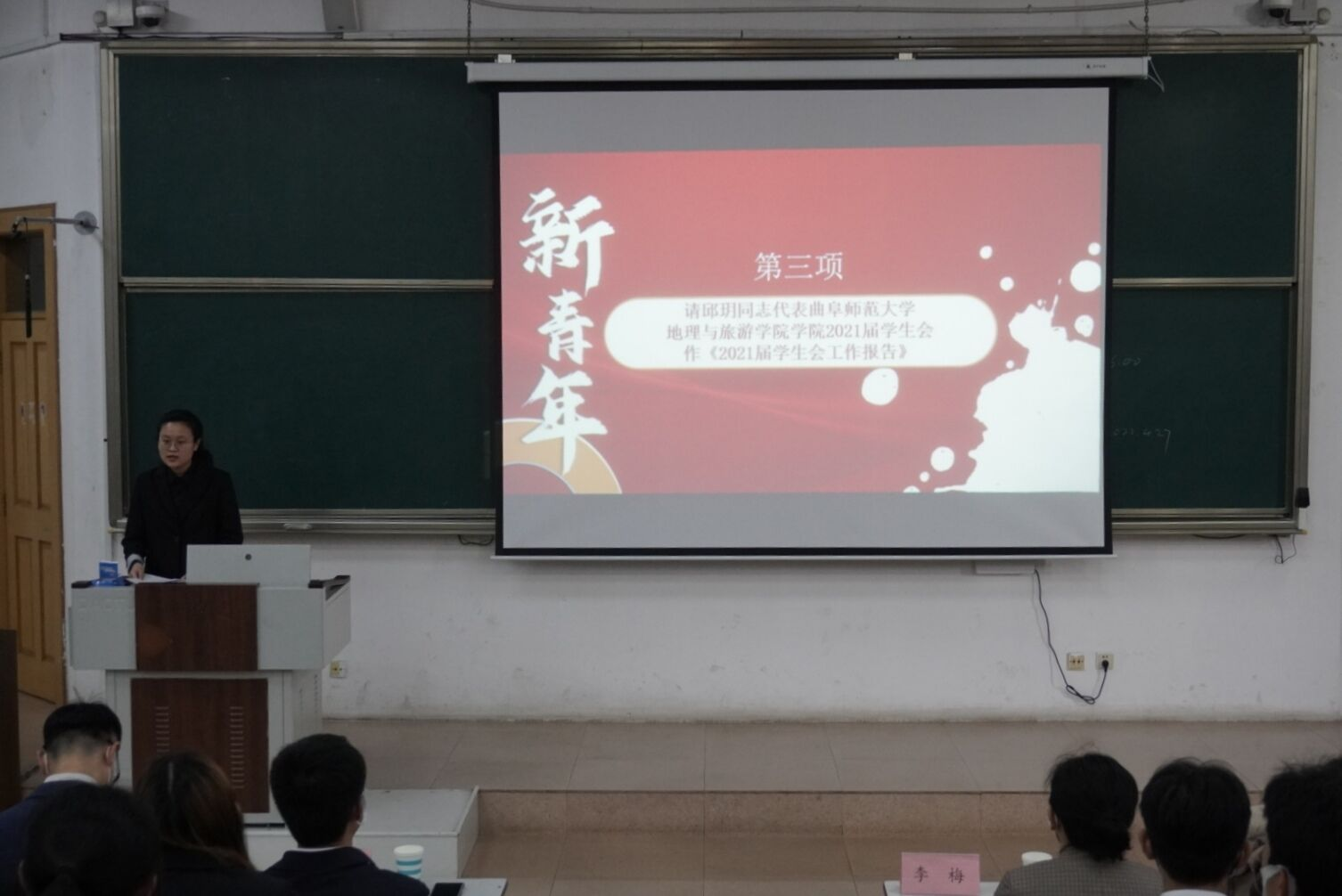 会上,邱玥代表学院2021届学生会作《2021届学生会工作报告》。她首先对一年以来各位老师对学生会工作的热情指导,大力支持和帮助以及学生会全体成员对学生会工作的紧密配合表示衷心的感谢。她从思想引领工作、学风建设工作、文体活动、日常工作四个方面向大会作报告。她表示,一年以来她和同学们一道投身于院学生会各项事务中,在学院党委、团委的指引下,在历届学生会工作的基础上,不断深化对学生会的认识,总结学生会工作的经验和教训,贯彻落实好学生会“自我服务、自我管理、自我教育”的职能要求,坚持“从同学中来,到同学中去”的原则,想同学之所想,急同学之所急。坚持全心全意为同学服务。她希望,2022届学生会成员团结一致,齐心协力,扎实工作,积极对待学生工作,成为一名富有责任心、成绩优秀、作风良好的优秀学生干部。