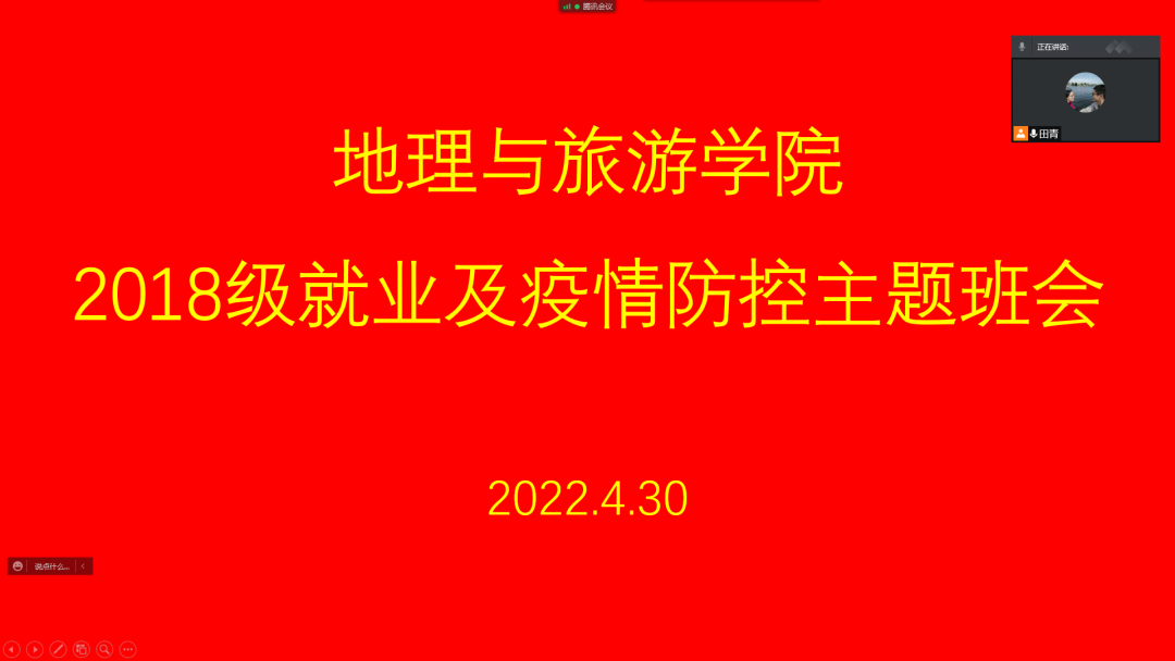 主题班会上,2018级辅导员田青结合滨城区教体系统校招情况,介绍了目前就业形势,建议同学们主动参与,积极尝试;备战考公考编的同学,要“两条腿走路”,积极抓住就业机会;鼓励部分省外同学,拓宽就业视野,多元多样化就业;详细介绍了西部计划招募、选拔等政策。他着重强调了宿舍消防安全、实验室安全、夏季防溺水、交通安全等安全问题,指出要保持积极心态和良好习惯顺利完成毕业季相关工作。2019级辅导员李梅强调要加强自我防控,保持安全社交距离,做到联络畅通,行程可控;要注意保护人身安全、财产安全、交通安全。她鼓励同学们积极锻炼身体,保持在常规化防疫下的身体健康和心理健康。2020级辅导员张乃宁嘱咐同学们要严格落实智慧曲园每日打卡制度和”宿舍——学校“两点一线,非必要不要离开学校驻地。她重点强调不要在宿舍使用大功率电器,一经发现从重处罚;指出由于教学进度的调整,要根据自身情况合理安排学习时间。2021级辅导员董青董青强调要勤洗手,戴口罩,做到每日打卡、健康生活。她提出:“作为新时代的中国青年,大家应以科学和理性的态度认识疫情,努力担起肩上的重任。一代人有一代人的长征,我们在保证自身安全的前提下,要积极投身到疫情防控志愿服务工作中去。“