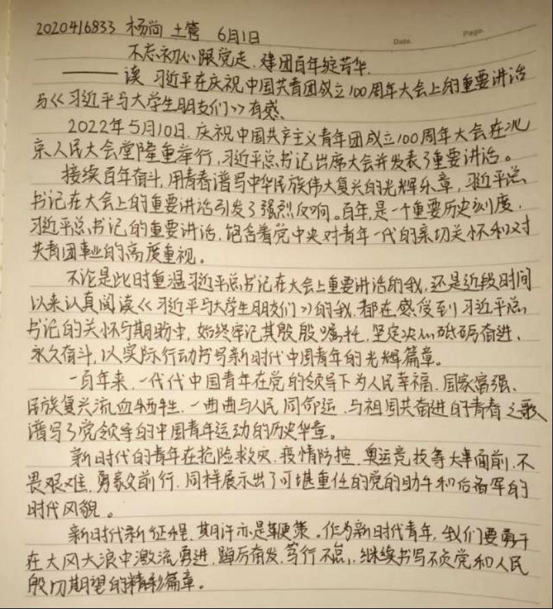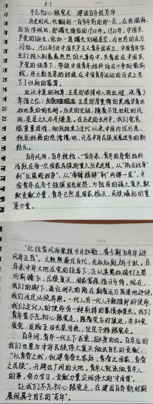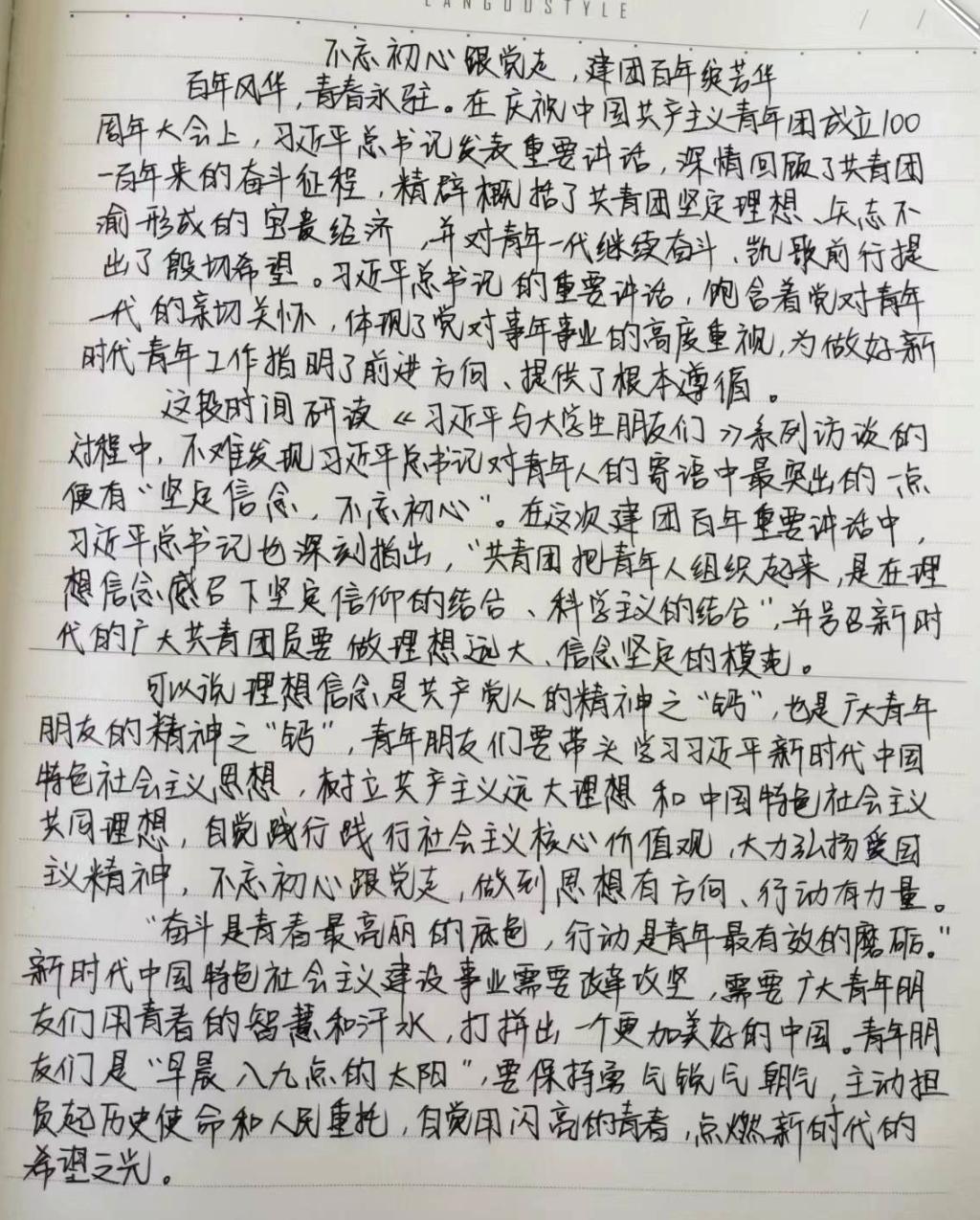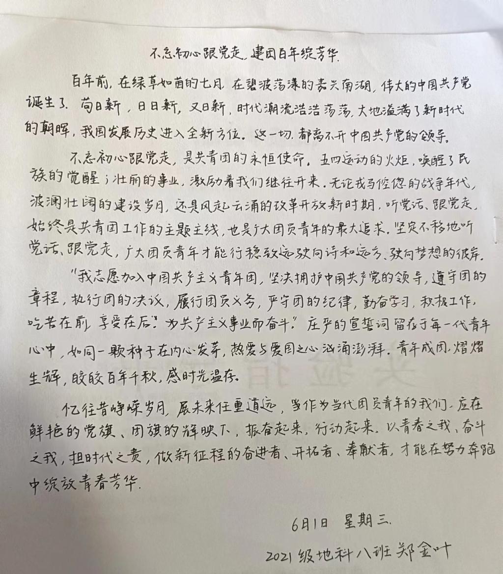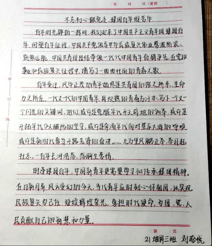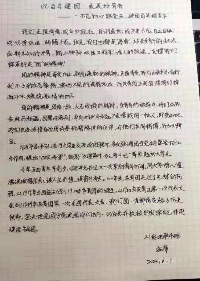 同学们,正值中国共青团一百周年诞辰之际,我们也应拿出最好的状态和最高的热情,肩负起历史赋予我们的使命,努力学习,积极奋斗,一起去书写美好的未来!