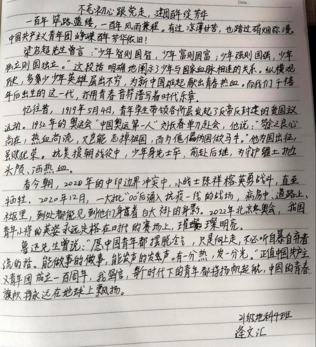 青年兴则国家兴,青年强则国家强。历经了一百年栉风沐雨,共青团始终坚定不移跟党走,团结带领共青团员和广大青年前赴后继,在党的领导下迈向共产主义的奋斗新征程。此次,特展开以“不忘初心跟党走,建团百年绽芳华”为专题的感悟活动。现将评选出多个优秀感悟作品展示如下,与大家交流分享。