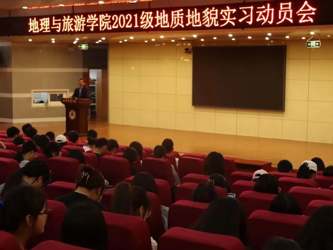 于图书馆报告厅举行2021级地理科学专业地质地貌实习动员会。学院党委书记苏占兵,院长张全景,地理科学教研室主任赵爽及2021级辅导员田青出席,2021级地理科学全体同学参加会议。学院党委副书记刘伟主持动员会。