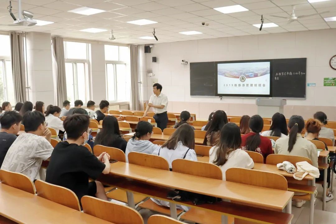 旅游管理专业优势在于规划,景区设计和旅游资源运营,希望同学们加强专业自信,找准自身定位,把握优势方向发展。在就业方面,他指出旅游管理班就业优于往年,主要在于班风学风好,班级文化优。要注重加强班级凝聚力,保持对学院、班级的归属感。随后,他强调要坚持“先就业,再择业”的原则,鼓励同学们提高自信,敢于尝试,主动搜寻相关就业信息,找到合适的就业岗位。最后,他指出大学生作为新时代青年要接续奋斗,脚踏实地,主动分析国际形势,加强民族自信,开拓自身眼界,强化专业知识,并祝福同学们在未来的成长和发展中取得满意成果。