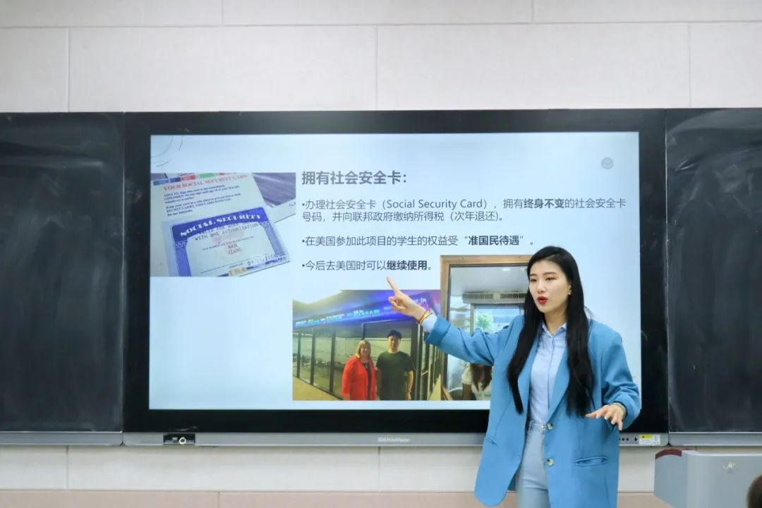 韩瑾凤主要从项目内容、项目意义、主办方介绍、实习工资与实习条件、报名条件等方面对大学生暑期赴美带薪实习项目进行介绍,其中,她对项目时间流程与同学们实习期间的生活安排进行详细介绍,并为同学们答疑解惑。