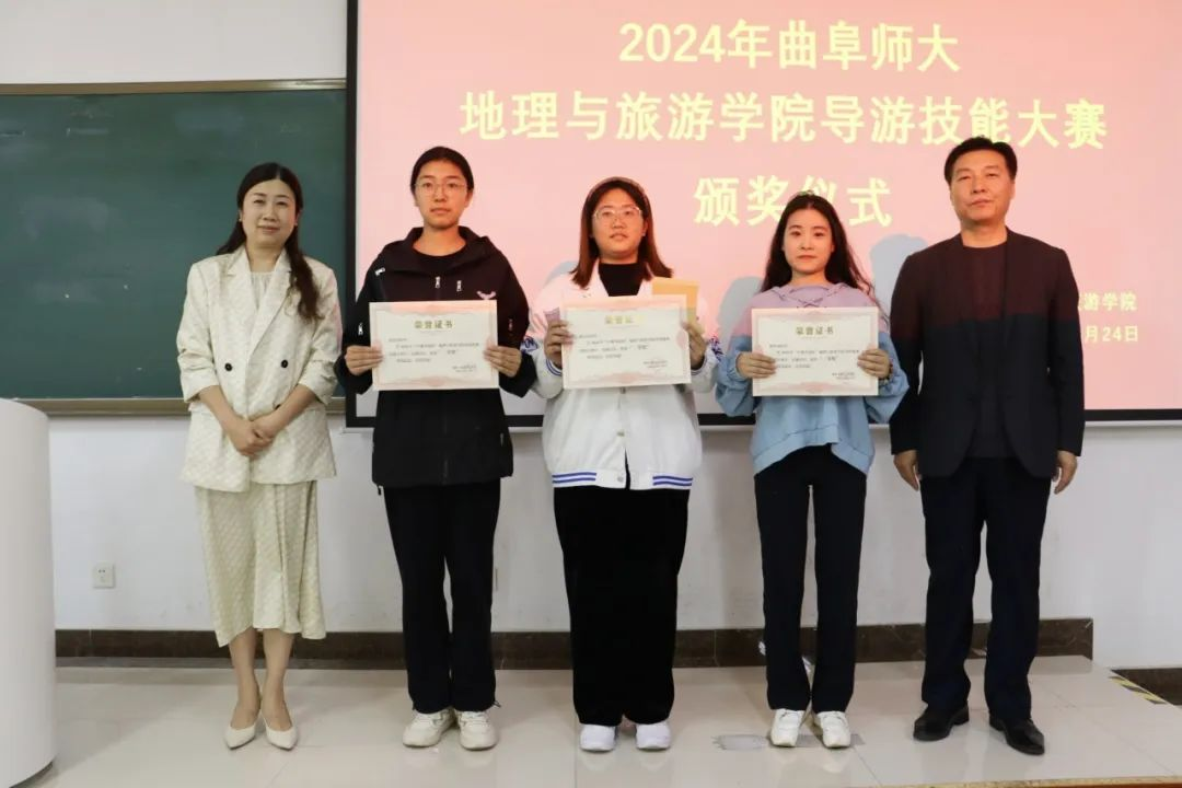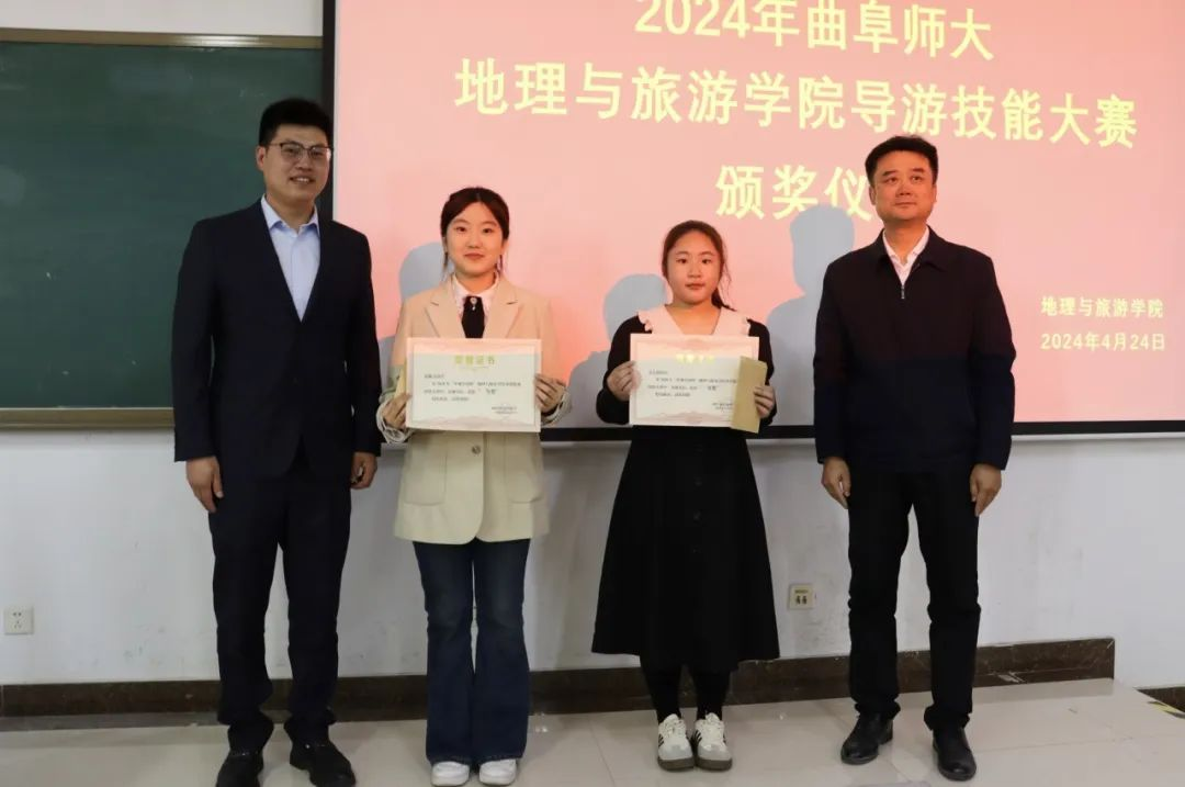 导游服务技能大赛获奖选手颁奖。获一等奖的盖艺蔚、罗雅文同学现场进行导游技能展示,胡圣才、韩笑、石峰详细提出了指导意见。