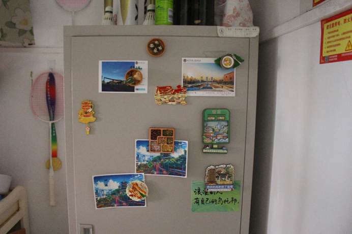 学子的自律习惯与生活态度。同时,各宿舍用城市风景明信片、特色文创磁贴等物件,对宿舍橱柜、墙壁等区域进行装饰,全面展示了宿舍一角风采,不仅装点了空间,又留下青春足迹。
