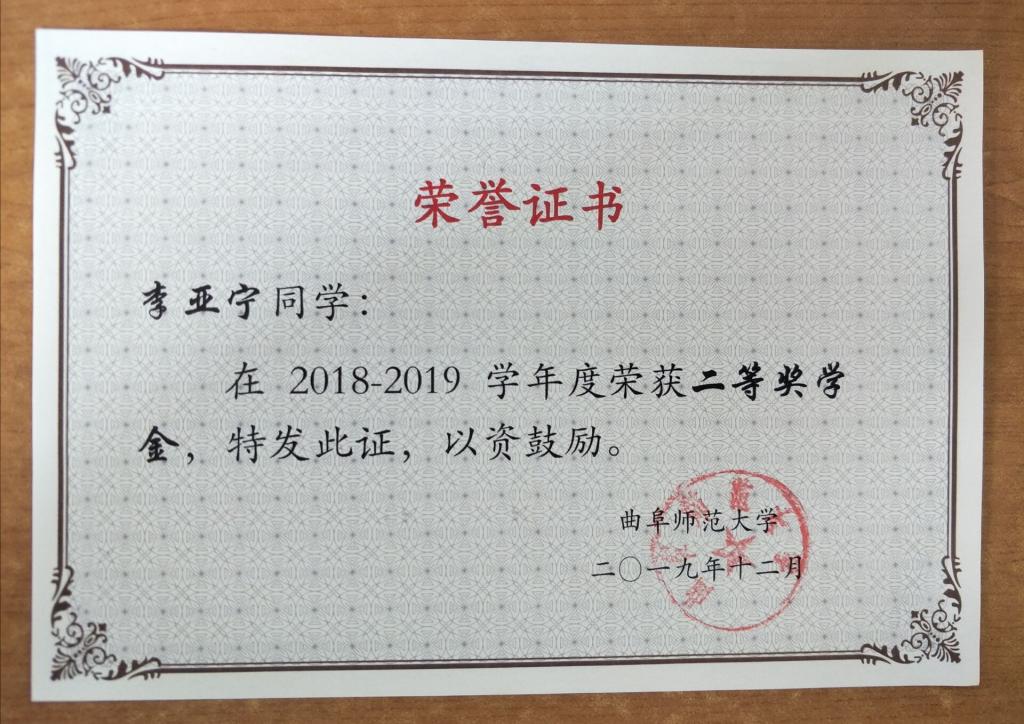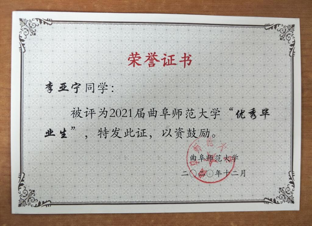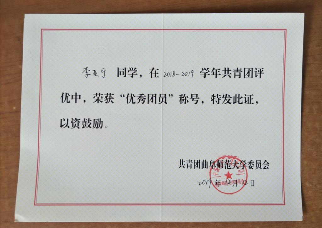 所获奖项:2018—2019年学,所在男子篮球队获得“最佳团体”称号