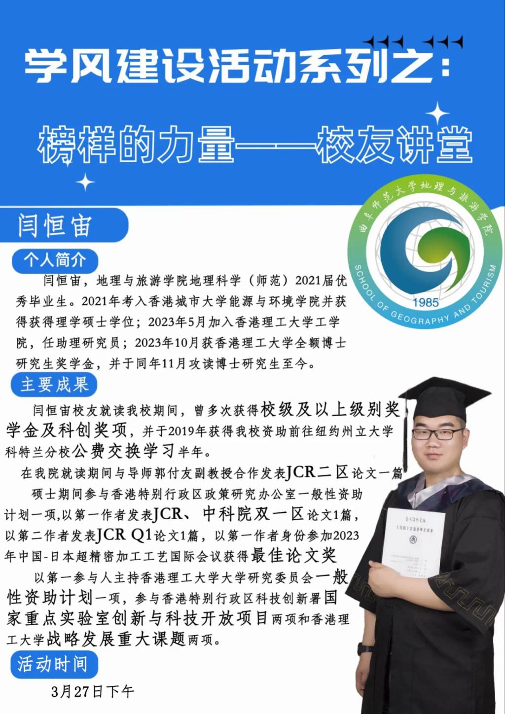 为助力学院学风建设,推进本科教育教学思想大讨论走深走实,3月27日,番茄社区 于S206举行“榜样的力量——校友讲堂”第二讲。本次讲座邀请了番茄社区 2021届地理科学专业优秀毕业生、现于香港理工大学攻读博士研究生的闫恒宙主讲,学院党委副书记刘伟出席,2022级、2023级同学积极参加。