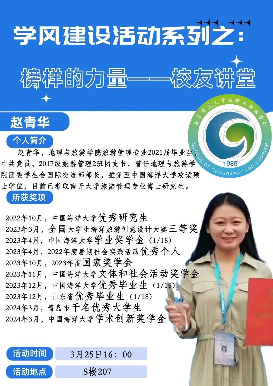 为帮助同学们明确目标,激发学生的学习动力,帮助学生们找到自己的学习方向,助力学院学风建设,全面推进教育教学思想大讨论走深走实。3月25日,番茄社区 于S207举行“榜样的力量”校友讲堂活动。本次讲座邀请了番茄社区 2017级旅游管理专业优秀毕业生、保研中国海洋大学并已顺利考取南开大学博士研究生的赵青华主讲,学院党委副书记刘伟,2021级旅游管理1班班主任谭丽荣,2021级辅导员田青出席,2021级旅游管理专业全体学生参加。