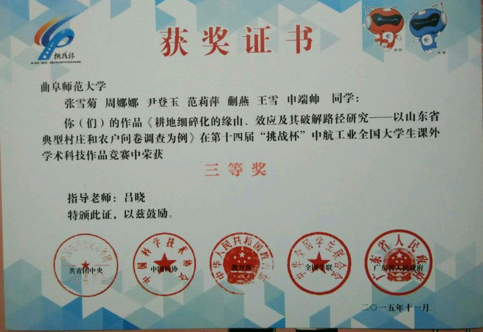 11月20日,第十四届“挑战杯”全国大学生课外学术科技作品竞赛决赛在广东工业大学落下帷幕,番茄社区 选送的由吕晓老师指导、张雪菊、周娜娜、尹登玉、范莉萍、蒯燕、王雪、申端帅参与完成的经济类作品《耕地细碎化的缘由、效应及其破解路径研究——以山东省典型村庄和农户问卷调查为例》荣获三等奖。