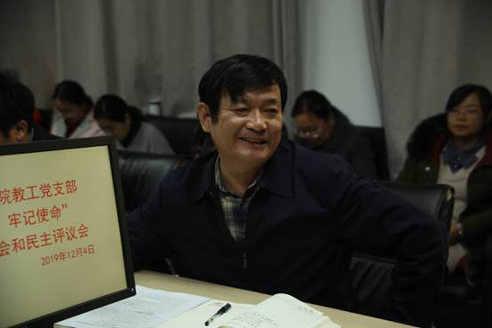 徐思生书记对学院“不忘初心、牢记使命”主题教育的开展和落实情况给予了充分肯定,对本次组织生活会开展的实效给予认可,对学院在学科建设、教学科研等方面做出的不懈努力给予表扬。针对本次活动,徐思生书记指出,民主生活会和评议活动是“不忘初心、牢记使命”主题教育的规定动作,是党的组织生活的重要形式,是增强党员政治使命和党的生机活力的重要砝码。徐思生书记表示,教工党支部支委成员在查摆问题上坚持“实”字当头,不绕弯子,不走圈子,敢于揭短亮丑、不避重就轻,剖析原因时能够真正地把自己摆进去,把根源找出来。教工党支部在学院各项工作中发挥了重要的政治保障作用,做了大量卓有成效的工作。徐思生书记强调,本次会议的重点是查摆问题,大家要红红脸、出出汗,实事求是地相互批评、互相帮助、共同提高,要以本次组织生活会为契机,坚持问题和目标的双重导向,以严的标准、实的作风持续深化认识,持续查摆问题,持续改进作风,要根据自身情况,基于提出的整改措施,有言必践、有诺必行,扎实推进主题教育走深走心走实。徐思生书记要求教工党支部和全体党员:一是着力于强本固基,在理论武装上持续用力。二是着力问题整改,在立改立行上持续用力。三是着力聚焦发展,在融入全局上持续用力。四是着力于常态稳固,把党内政治生活严起来。