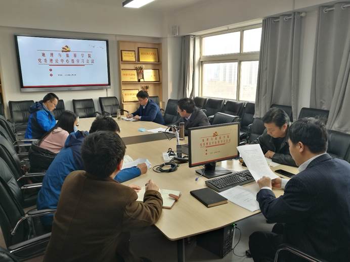 2020年4月8日下午3:00,学院党委理论学习中心组在党员活动室举行(扩大)学习会。学院党委书记苏占兵、院长张全景、党委副书记刘伟、副院长吴军、院长助理于伟出席会议,教工党支部书记刘志刚、本科生党支部书记宁晓文、教工党支部委员石峰、张学波参加会议。