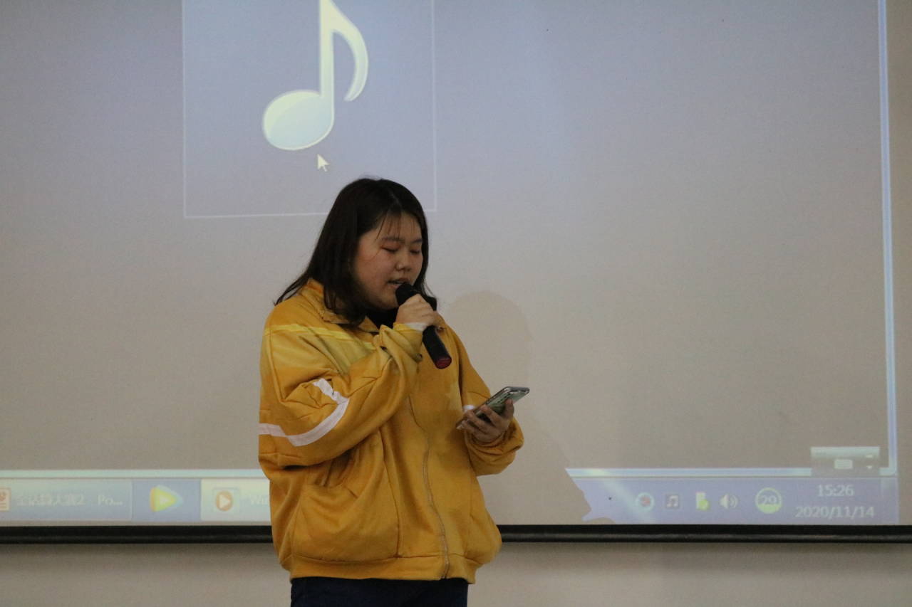 本次大赛分为主持场和歌唱场两个场次。主持场包括自我介绍、个人朗诵、晚会主持三个环节,参赛选手着装得体、落落大方,演讲时吐字清晰标准,语调抑扬顿挫,充分体现自身良好的组织表达能力和独特的主持风采,赢得现场观众热烈掌声。歌唱场包括个人表演、即兴清唱两个环节,参赛选手精神饱满,表演流畅自然,用歌声完美地诠释着自己随机抽中的汉字,展现出自身敏捷的应变能力和良好的歌唱功底。大赛期间,文艺小组李翼展、杨璐、田嘉恒、毛璇、于洪源、王宏宇、张迅为现场观众献上歌舞表演、歌唱表演及说唱表演,其曼妙的舞姿、动人的歌声为观众带来一场视听盛宴。