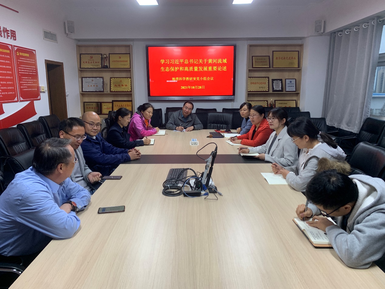 教工党支部各党小组组织开展了学习活动,并结合专业特色进行了深入研讨。地理科学党小组各位党员同志根据自身研究方向,讨论了关于黄河流域不同河段存在的问题,并计划围绕水资源调控、生态环境保护、水利工程建设等议题开展研究,努力为黄河流域区域发展提供理论和技术支持。自然地理党小组在深入学习习近平总书记重要讲话的基础上,围绕“合理利用湿地资源,实现区域营养盐平衡”展开研讨,在区域氮磷污染物的统防统治和陆源氮磷污染物排放监督管理等方面提出对策建议。人文地理党小组各成员结合自身在城市与区域发展研究方面的专长,在黄河中上游生态保护与区域发展、黄河中下游重点城市的发展规划、黄河流域水资源开发与配置、黄河流域水环境监测与灾害防控等方面进行了深入讨论。旅游管理党小组针对课堂思政如何更好得融合课堂教学展开讨论,党小组成员介绍了各自的课堂思政建设经验,并对如何更好得服务地方经济发展进行了讨论。土地资源管理党小组对黄河流域土地利用转型与集约开发展开研讨,提出要进一步强化土地保护,提高土地利用效率,开展土地利用冲突研究,助力黄河流域生态保护和高质量发展。地理信息科学党小组结合各位党员在遥感、生态方面的研究特长,讨论了黄河流域的土地资源与生态环境保护面临的问题,对黄河流域资源监测提出了一些方法设想,力图通过相关研究为黄河流域资源开发与保护做出贡献。党员同志们积极响应,深入交流,提出了大量极具建设性的意见。