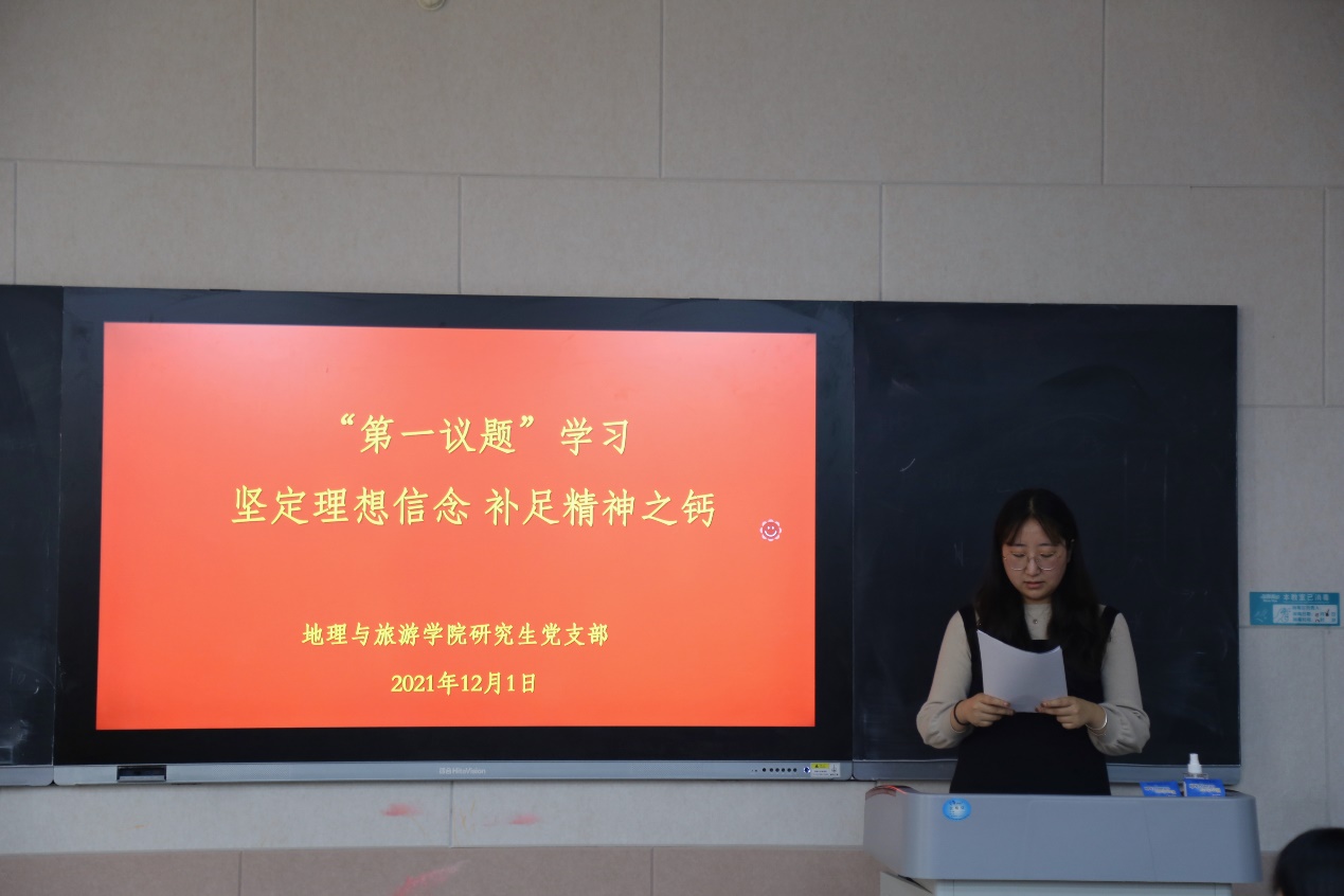 会上,全体党员同志进行了“第一议题”的学习,支部组织委员张园园带领全体党员同志学习了习近平总书记2012年11月17日在十八届中央政治局第一次集体学习时的讲话《坚定理想信念,补足精神之钙》。文章强调,理想信念就是共产党人精神上的“钙”,没有理想信念,理想信念不坚定,精神上就会“缺钙”,就会得“软骨病”。学习结束后,何传涛同志认为“只有坚守理想信念,不忘初心、牢记使命,我们才能战胜来自国内外的各种重大风险挑战,夺取中国特色社会主义新胜利,实现中华民族伟大复兴的中国梦。作为一名研究生,我要坚定自己的理想信念,用实际行动为实现共产主义远大理想不懈奋斗。” 陈秀艳同志表示,“通过学习,我认为‘追求远大理想,坚定理想信念’是我们每一个新时代的青年人必须坚持的目标。一方面,我们需要用实际行动去展现它,在学习专业知识、培养专业能力的同时,要不断地提升自身道德素质,树立正确的社会主义价值观;另一方面,我们有必要在喧闹浮躁的社会环境之中安静下来,宁静致远,重新审视当代青年的使命和责任,将自己的理想目标与社会责任联系起来”。