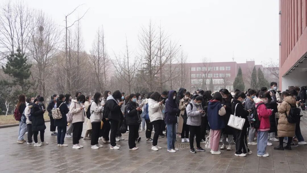 近日气温骤降,多名志愿者在寒风中积极组织同学们有序进行核酸检测。虽寒风瑟瑟,但志愿者们仍以极大的热情为同学们能够高效进行核酸检测而努力,在检测地点入口处为同学们服务。
