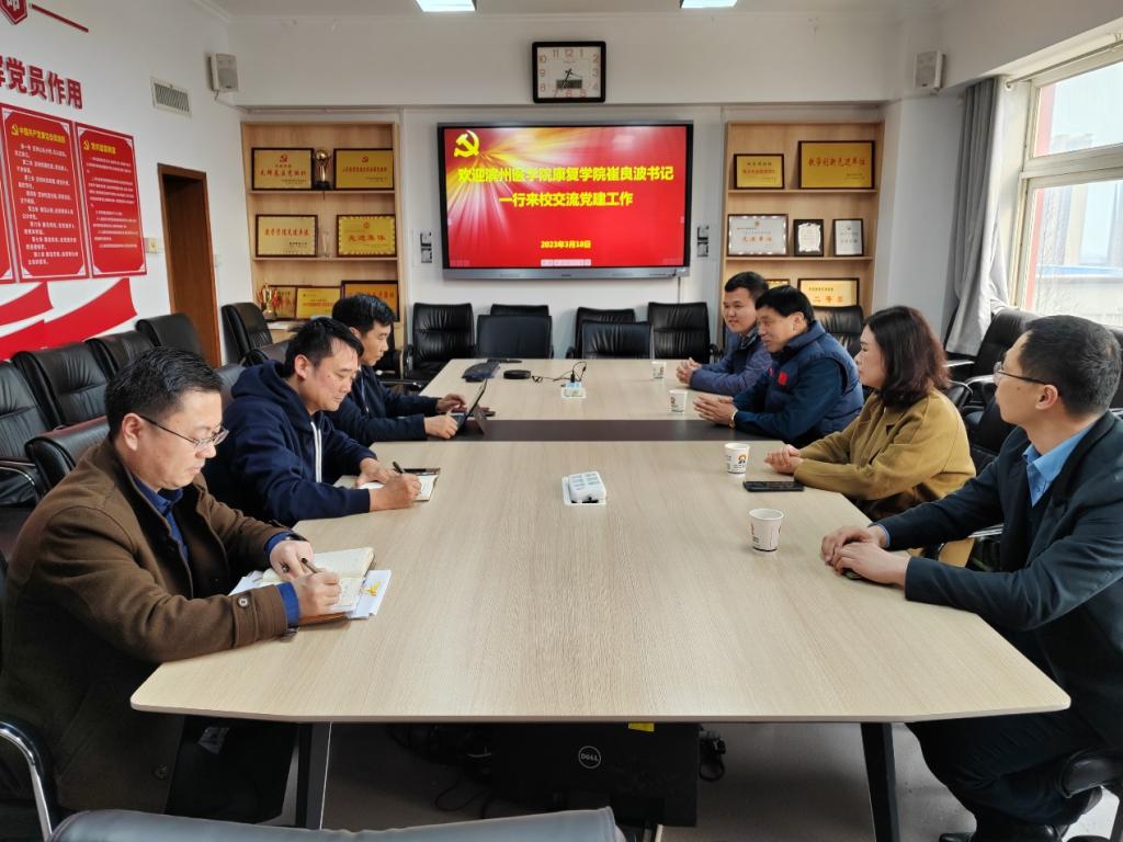 苏占兵对滨州医学院康复医学院一行的来访表示热烈欢迎,随后介绍了学院基本情况,详细介绍了学院培育创建“山东党建工作标杆院系”的思路、方案、工作举措与取得成效。刘伟、于伟结合学生党员培养和课程思政等方面的典型做法做了交流。