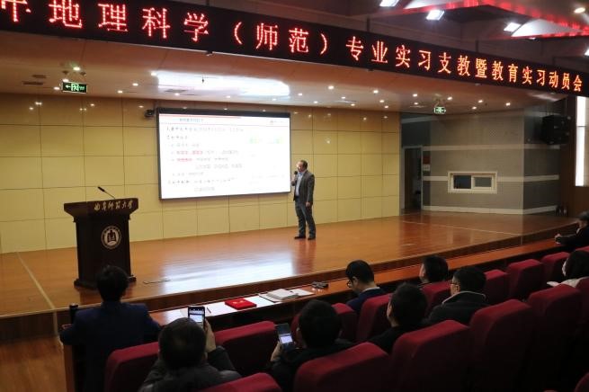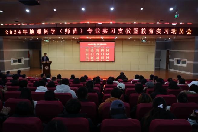 于图书馆报告厅召开2024年地理科学(师范)专业实习支教暨教育实习动员大会。学院党委副书记刘伟、副院长吴军教授、辅导员田青老师及全体教育实习指导老师出席,2021级地理科学师范专业全体同学参加大会。副院长吴军主持了动员大会。