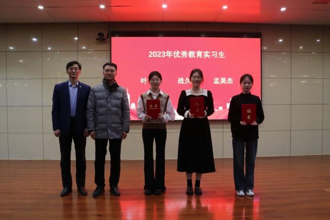 会上,学院对2023年教育实习表现优秀的同学进行了表彰。叶繁、战久宁、孟昊杰、朱子青四位同学获学院首届“优秀教育实习生”称号。刘伟副书记、吴军副院长共同为获奖同学颁发荣誉证书。