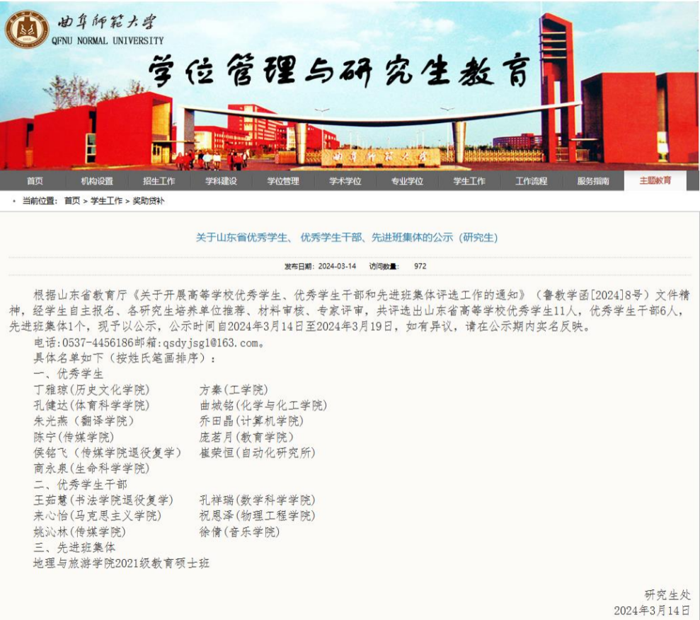 近日,山东省教育厅发布了《关于开展高等学校优秀学生、优秀学生干部和先进班集体评选工作的通知》(鲁教学函[2024]8号)。根据文件精神,经学生自主报名、各研究生培养单位推荐、材料审核、专家评审,共评选出山东省高等学校优秀学生11人,优秀学生干部6人,先进班集体1个。番茄社区