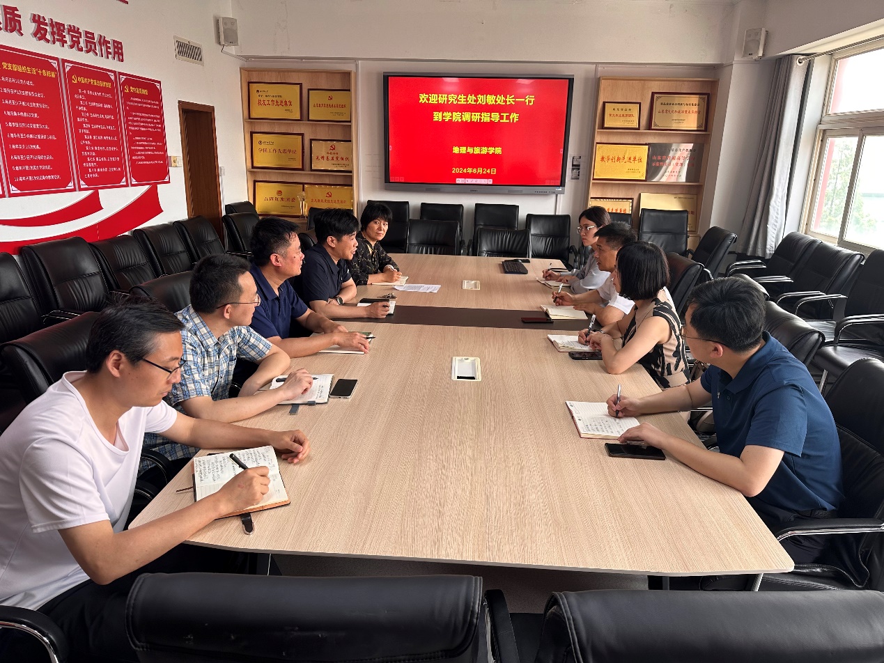 的研究生培养质量,希望学院重点围绕地理学学科建设开展有针对性的工作,对照博士点申报要求谋划每一个条件,力争在下一轮学位点申报中取得突破。围绕地理学、旅游管理学位授权点周期性评估,刘敏处长要求认真撰写评估报告,做好专家论证,按时按质完成评估工作,并要求根据专家意见和建议进行改进提升。