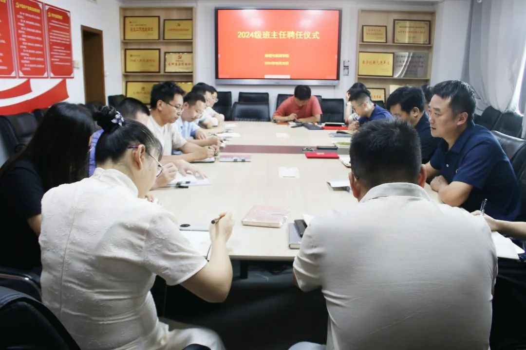 于会馆2401会议室举行2024级新生班主任聘任仪式暨新生班主任上岗谈话。学院党委书记苏占兵,院长张全景、2024级辅导员张乃宁、公惟莹以及2024级全体班主任参加,学院党委副书记刘伟主持活动。