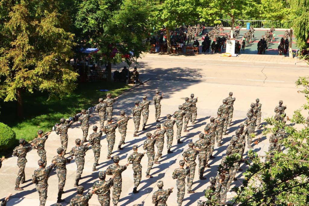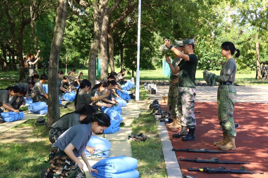 教官为同学们讲解内务整理技巧,同学们积极练习